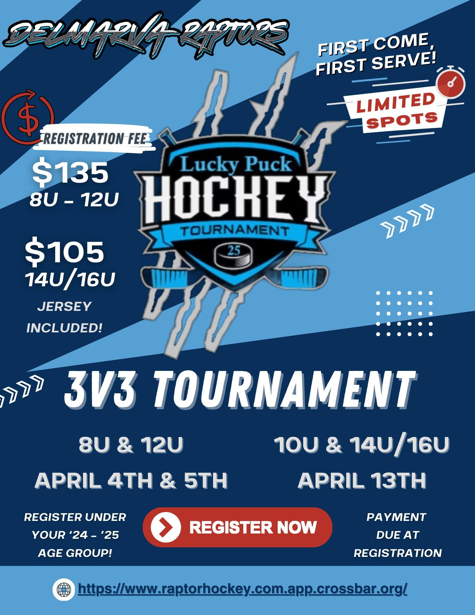 We are so excited for our 3rd Annual Raptors Lucky Puck 3v3 Tournament! We are expanding this year and holding separate divisions for each age group beginning with 8U! Teams will be randomly selected the day of, so sign up now to secure your spot! First come, first serve!